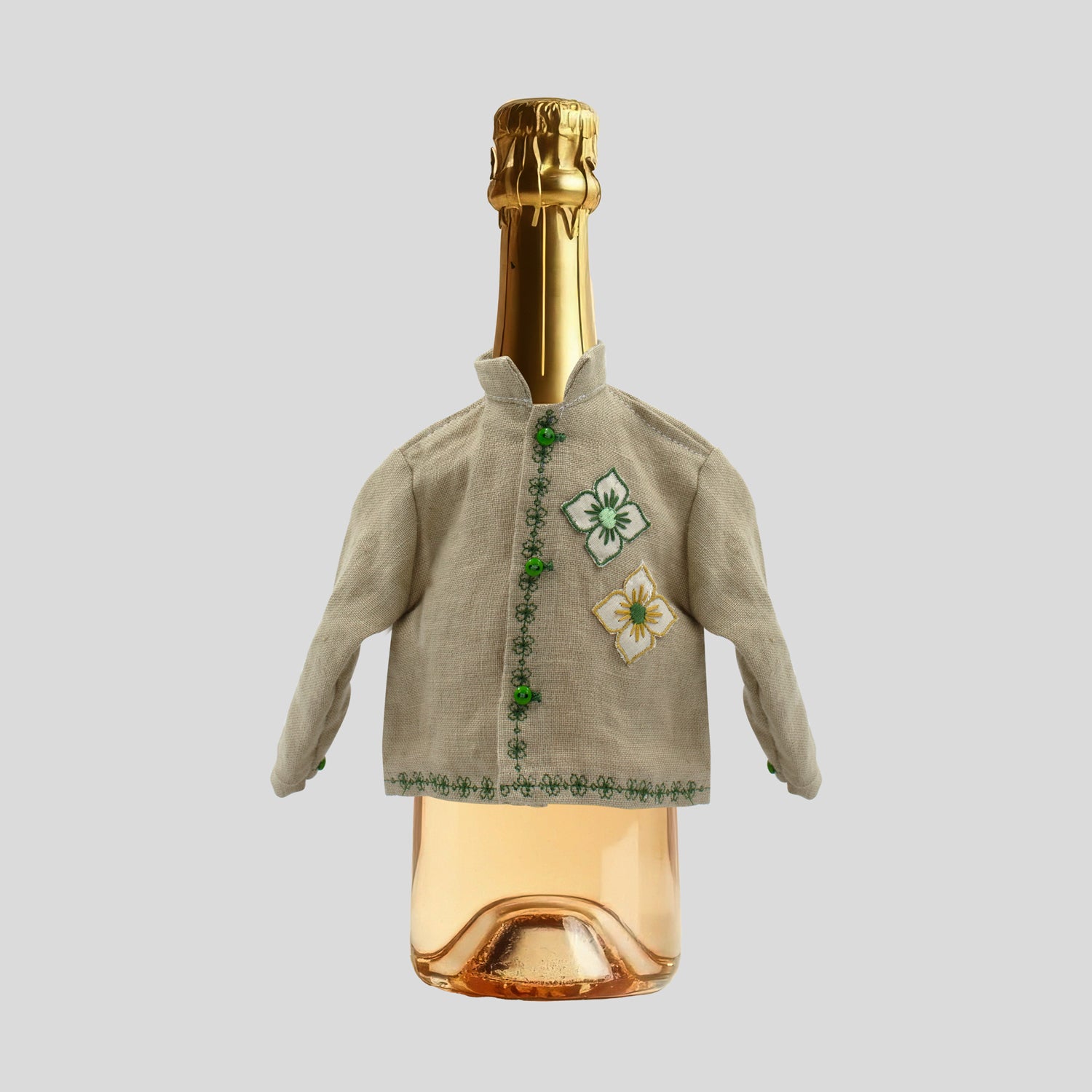 Copribottiglia artigianale ricamato in Italia con cotone makò su misto lino.