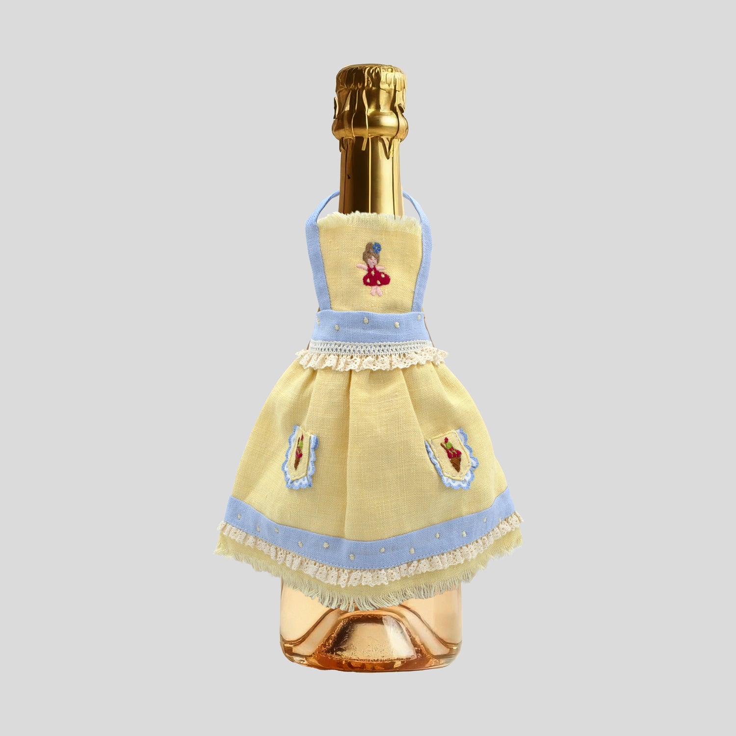 Copribottiglia artigianale ricamato in Italia con cotone makò su misto lino.